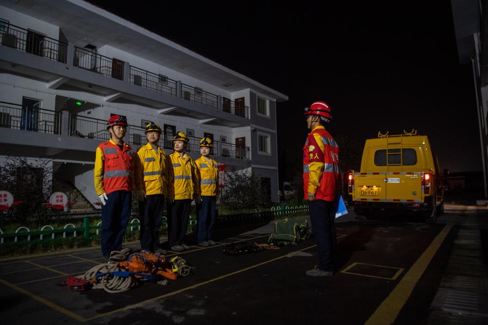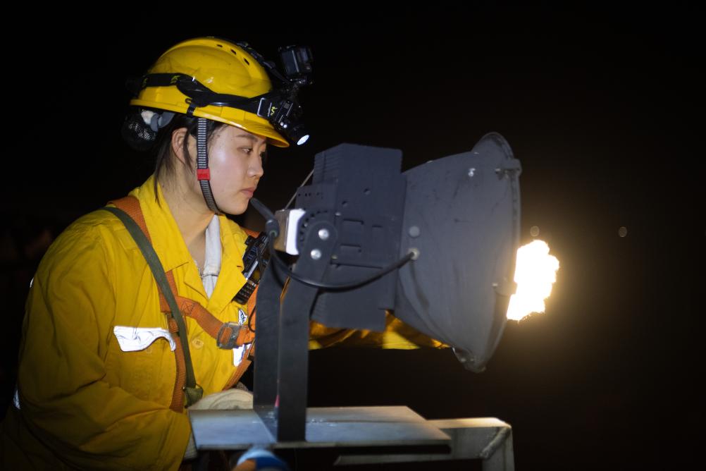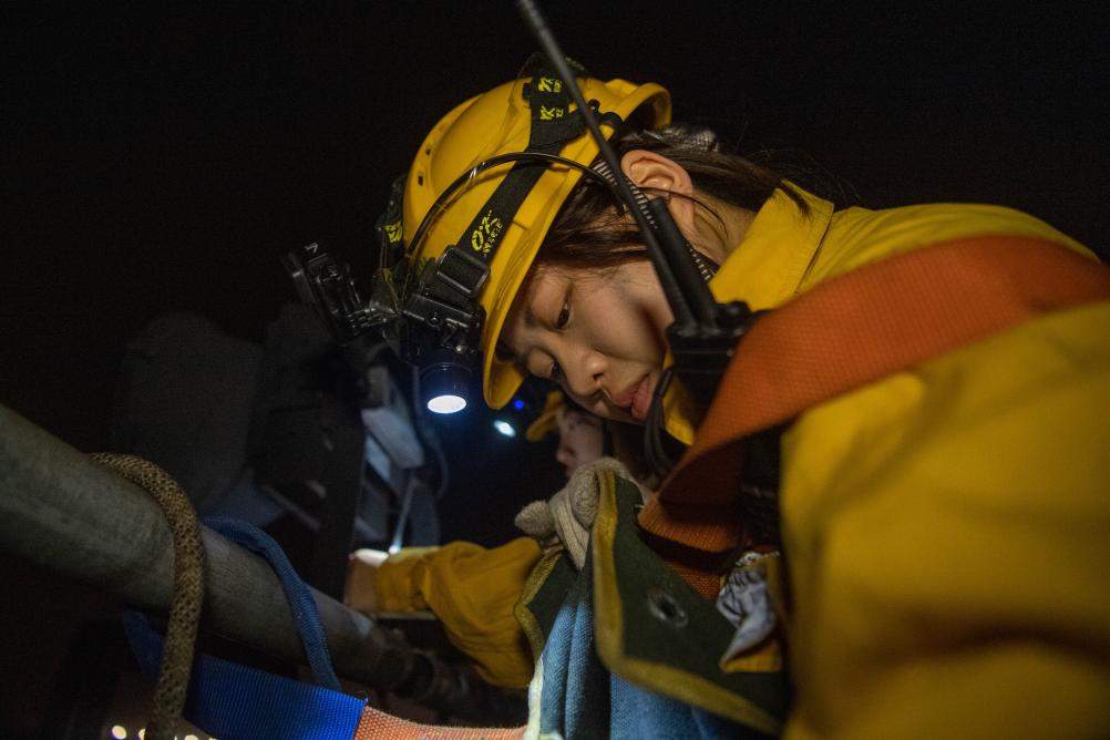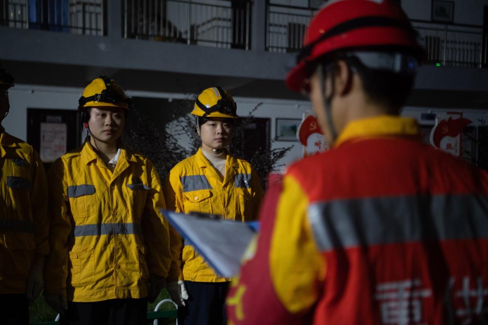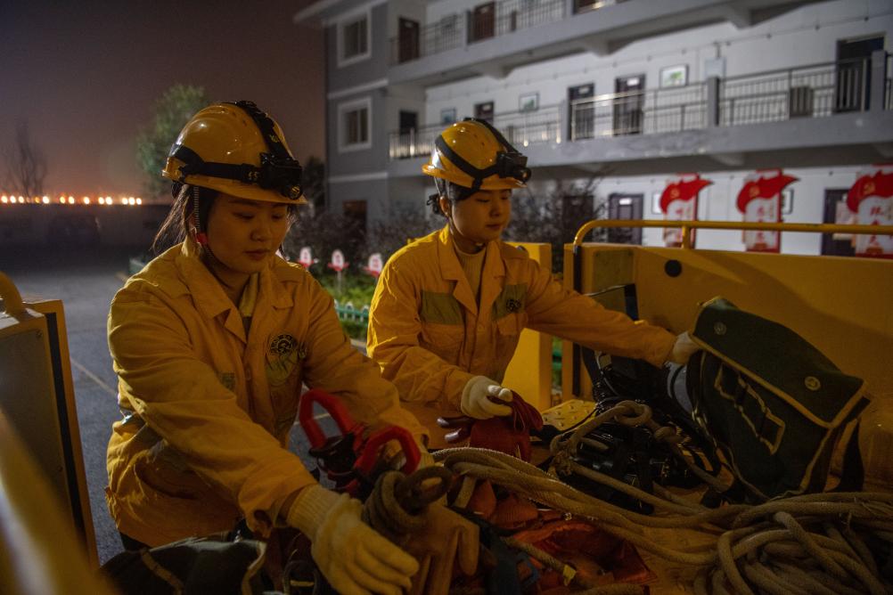 “00后”女孩何雪和母思琪是中国铁路成都局重庆供电段兴隆场电力工区的两名电力线路工。每个夜晚,她们和工友背负数公斤重的工具材料,从地面沿着近70度的爬梯攀上22米高的电塔和17米高的灯桥,对这里的5000余盏灯进行巡检维修,确保编组站场的照明安全。