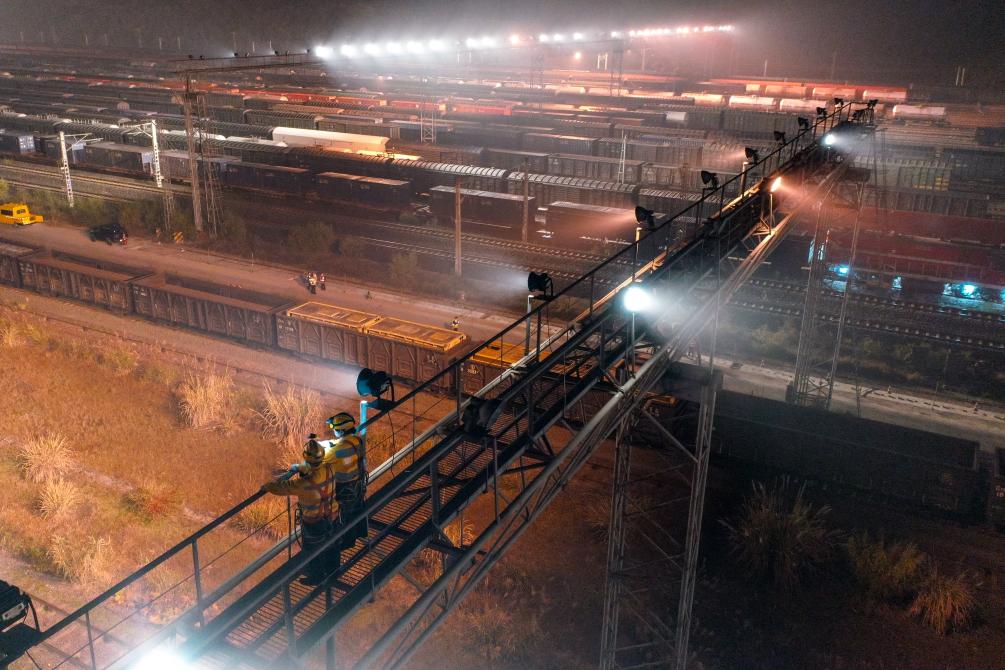 1月12日,在重庆兴隆场编组站15号灯桥上,何雪和母思琪站在灯桥上查看编组站其他灯桥灯光灯具发光情况(无人机照片)。新华社记者 唐奕 摄