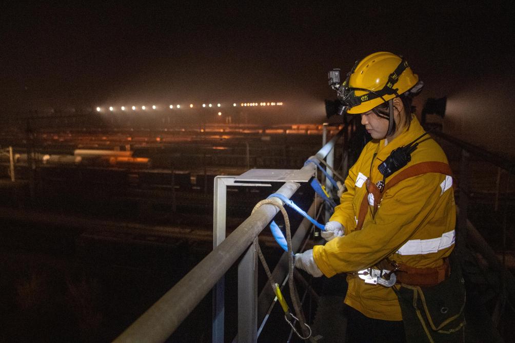 1月12日,在重庆兴隆场编组站15号灯桥上,母思琪在挂安全带。新华社记者 唐奕 摄