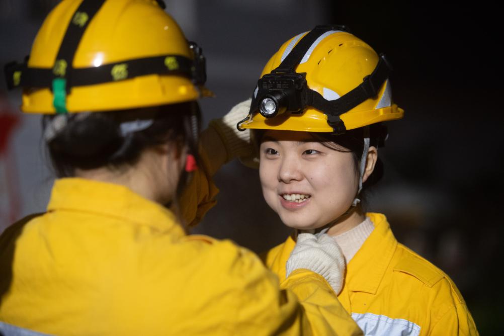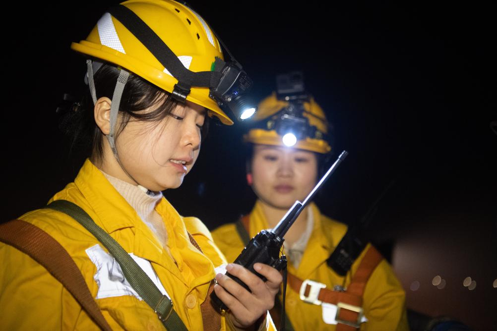 1月12日,母思琪(左)和何雪在进行作业前对讲机通话试验。新华社记者 唐奕 摄