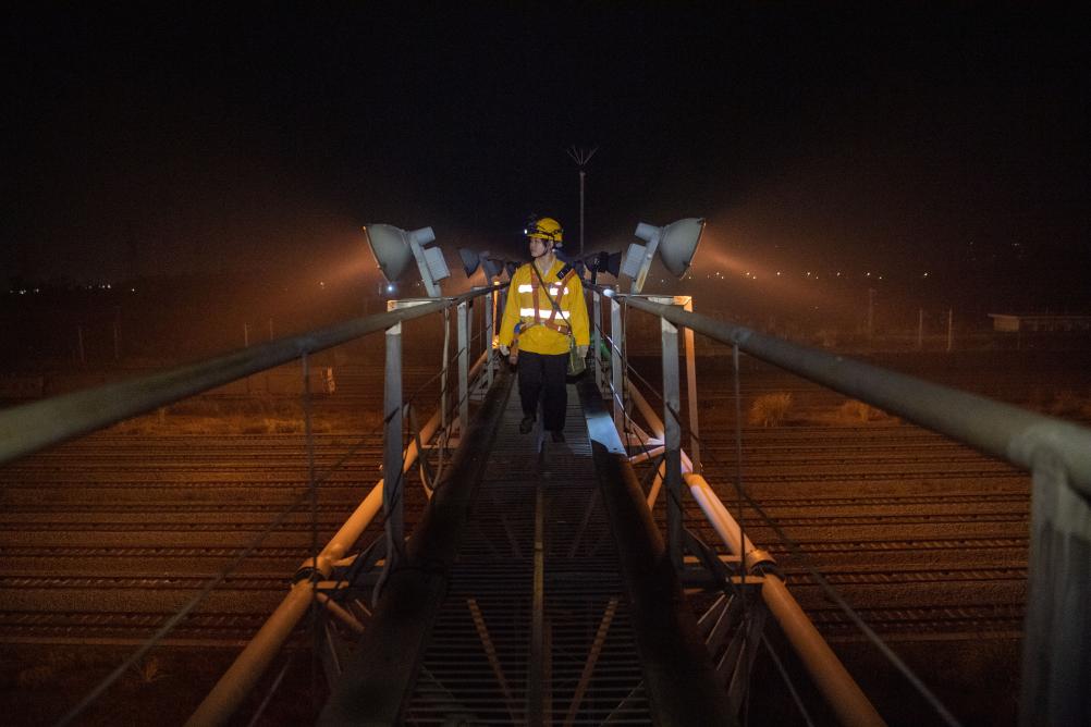 1月12日,在重庆兴隆场编组站15号灯桥上,母思琪在巡查灯具设备运行情况。新华社记者 唐奕 摄