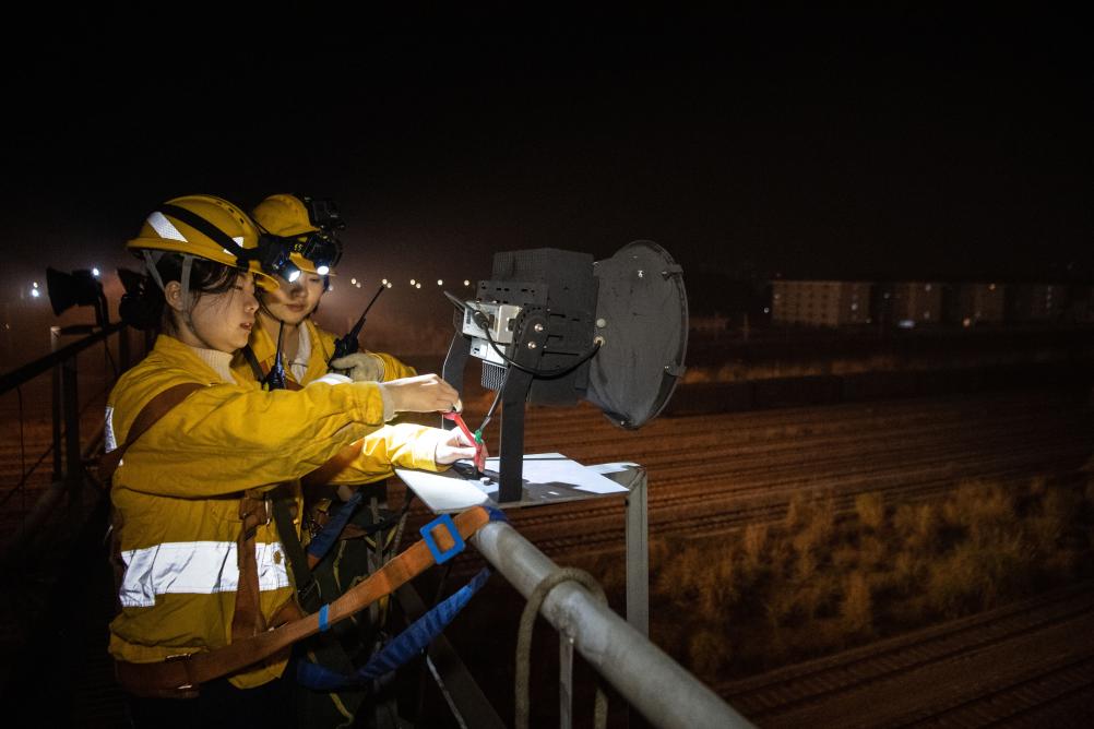 1月12日,在重庆兴隆场编组站15号灯桥上,母思琪(左)使用对讲机通知地面配合人员控制电源试验灯具。新华社记者 唐奕 摄