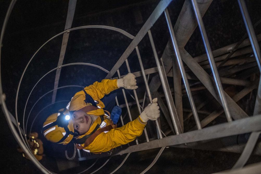 1月12日,在重庆兴隆场编组站,母思琪通过上下扶梯准备登上灯桥开展检修作业。新华社记者 唐奕 摄