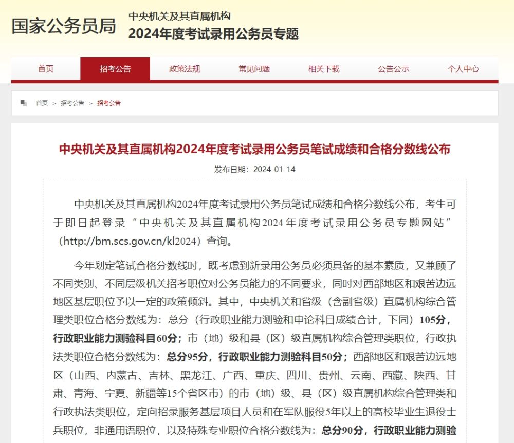 中央机关及其直属机构2024年度考试录用公务员笔试成绩和合格分数线公布,考生可于即日起登录“中央机关及其直属机构2024年度考试录用公务员专题网站”(http://bm.scs.gov.cn/kl2024)查询。