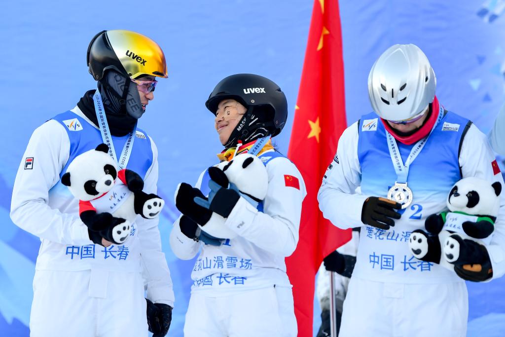 12月17日,获得亚军的中国二队选手陈梅婷(中)、王心迪(右)和李天马在颁奖仪式上。当日,2023-2024赛季国际雪联自由式滑雪空中技巧世界杯(中国长春分站赛)男女混合团体决赛在吉林长春莲花山滑雪场举行。新华社记者 许畅 摄