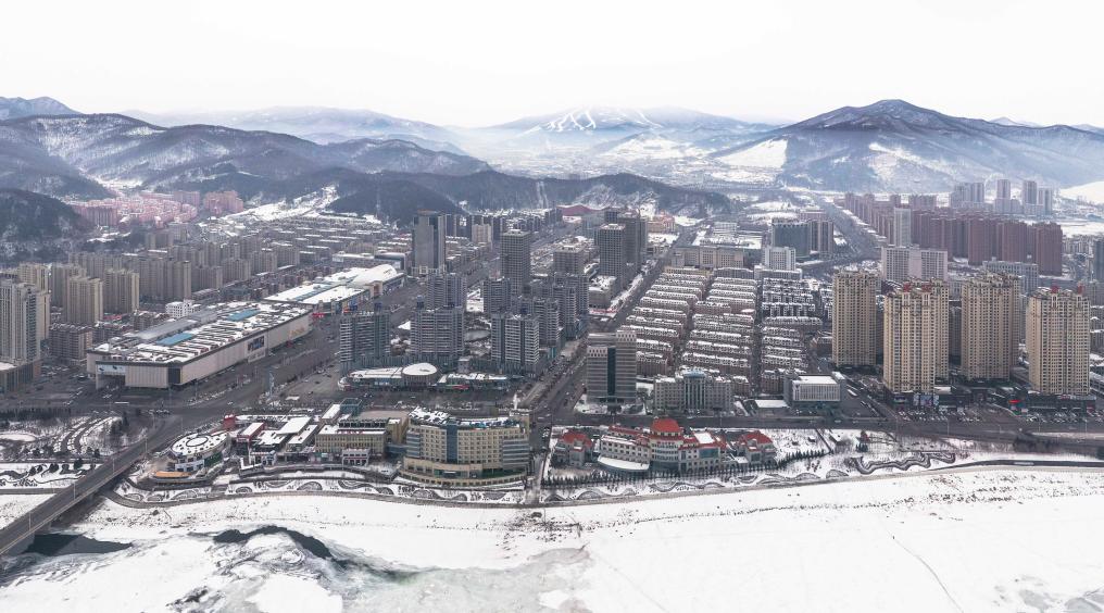 吉林省通化市城区和远处的万峰通化滑雪度假区(无人机照片)。新华社记者 许畅 摄