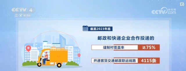 数据显示,截至2023年底,中国邮政建成1061个县、6010个乡镇的邮政处理中心和40万个邮政及邮乐购村级站点,邮政和快递企业合作投递的建制村覆盖率达75%,开通客货交通邮政联运线路4115条。