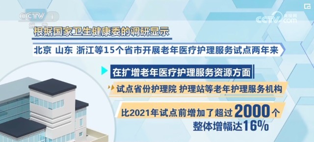 数据显示,我国60岁及以上老年人已达2.8亿。其中,超4000万人失能、半失能,需要专业医疗护理服务。国家卫生健康委调研显示,北京、山东、浙江等15个省、市开展老年医疗护理服务试点两年来,在扩增老年医疗护理服务资源方面,试点省份护理院、护理站等老年护理服务机构数量明显增加,比2021年试点前增加了超过2000个,整体增幅达16%。