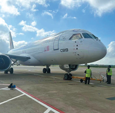 2023年5月28日,国产大型客机C919完成首次商业航班飞行,标志着该机型正式进入民用航空市场。图为东航C919在主营基地上海虹桥国际机场整装待发。