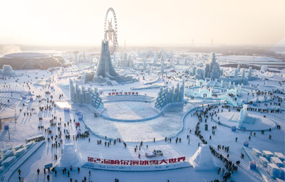 黑龙江哈尔滨冰雪大世界占地81万平方米,25万立方米的冰和雪幻化成上百个精美景观。