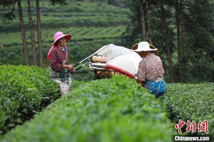 资料图:村民在贵州铜仁江口县闵孝镇提红村抹茶种植基地采收抹茶茶青。李鹤 摄