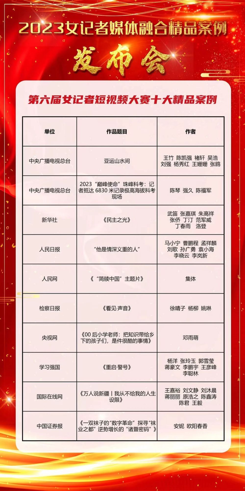 会上首都女记协副会长兼秘书长张明非宣布了入选第六届女记者短视频十大精品案例: