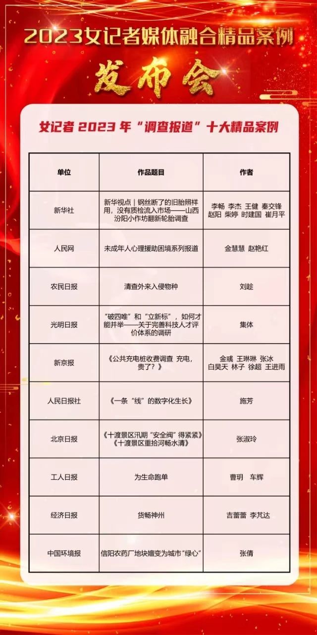 首都女记协监事长王苏宁宣布了入选女记者2023年“调查报道”十大精品案例: