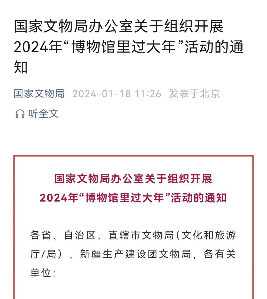 国家文物局1月18日发布通知,对做好2024年“博物馆里过大年”活动进行部署,提出鼓励各地博物馆统筹多方资源,策划推出以春节文化为主题的系列展览、丰富多彩的年俗文化体验活动和文物公益鉴定咨询服务,营造浓郁热烈的节日氛围,丰富春节期间人民群众文化生活。