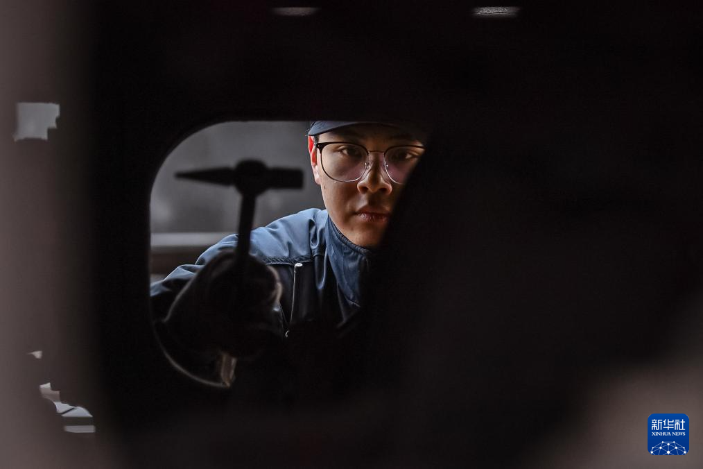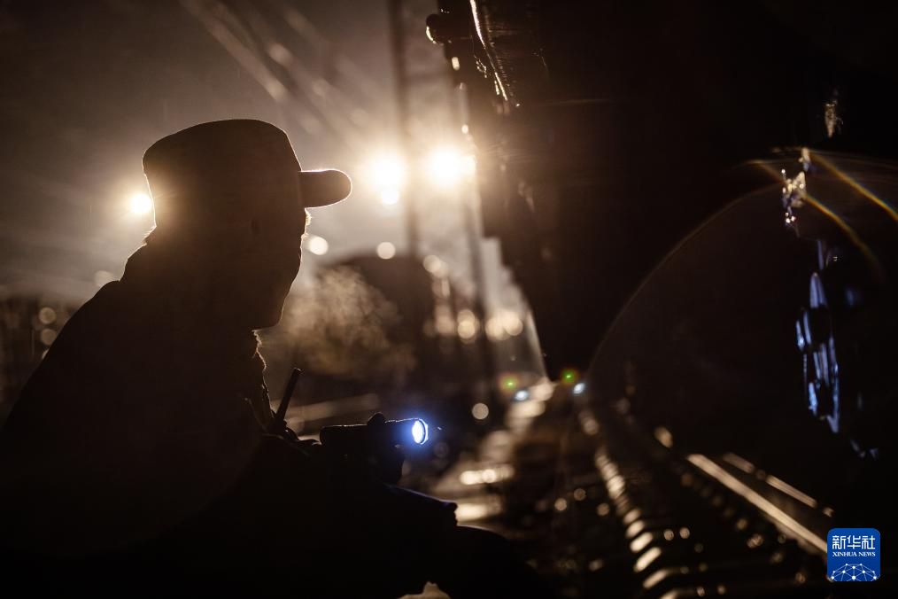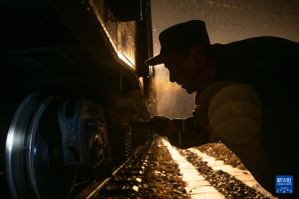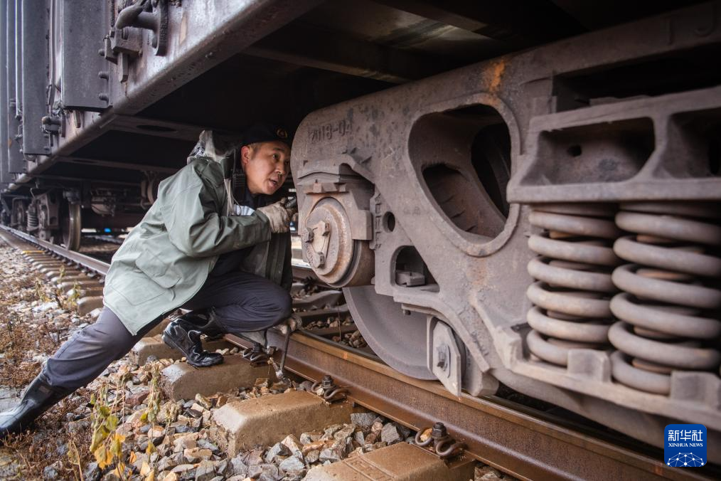 1月17日,检车员在检查车轮踏面侧架等车辆走行部。新华社记者 伍志尊 摄