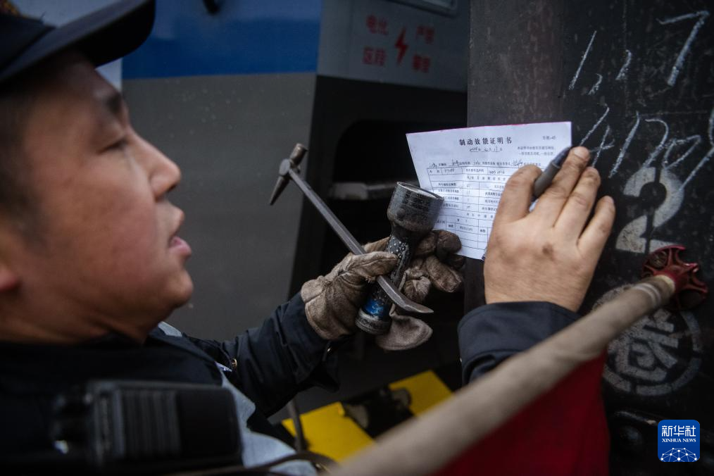 1月17日,检车员在检车完毕后填写制动效能证明书。新华社记者 伍志尊 摄