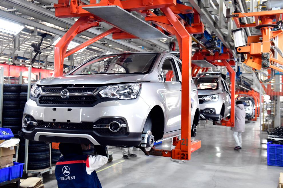 2024年1月12日,在日照鸿日新能源汽车有限公司,工作人员在整车生产线上忙碌。新华社记者 郭绪雷 摄