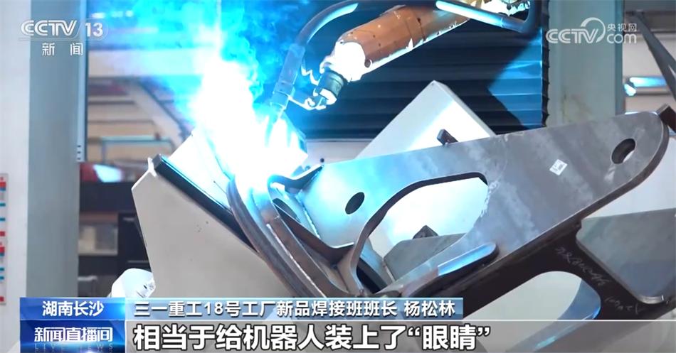三一重工18号工厂新品焊接班班长 杨松林:这就是我工作的地方。这边有一排排的工作岛,稳居“C”位的就是我们的转台焊接工作岛。依托数字化电弧跟踪技术,相当于给机器人装上了“眼睛”,焊枪可以自己去寻找锁定,并跟踪焊点,实现连续性的焊接,在行业还是首创,我们的效率和质量都大大提升了。