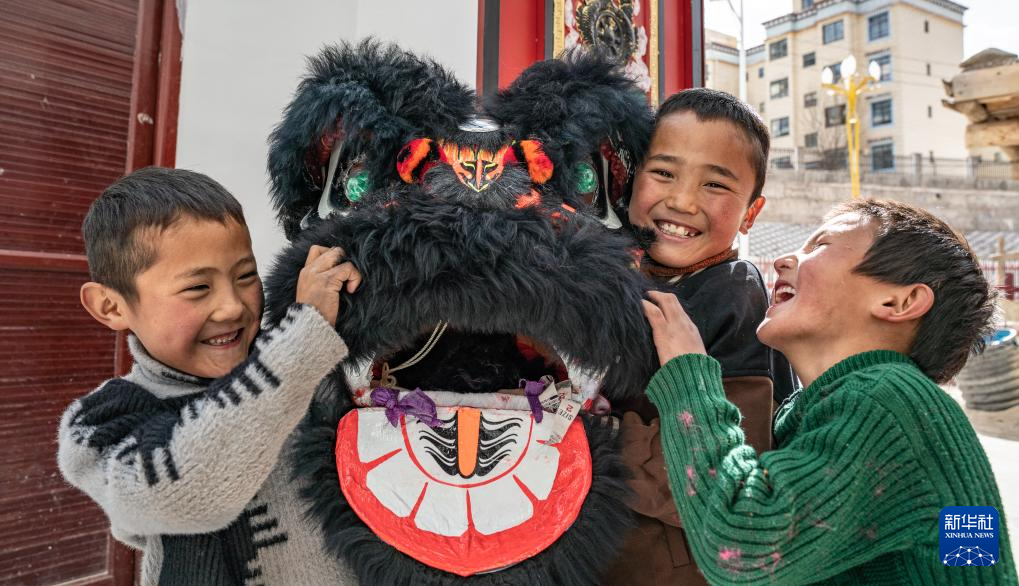 1月19日,在西藏昌都市洛隆县硕督镇硕督村,孩子们手捧狮子舞道具玩耍。新华社记者 丁增尼达 摄