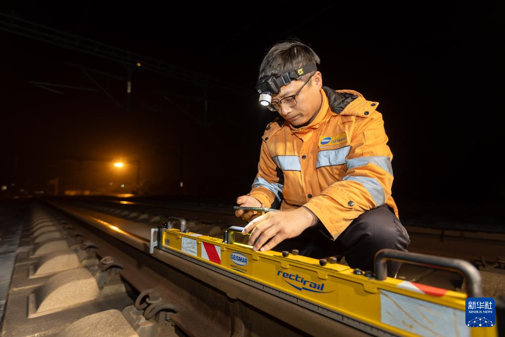 1月18日凌晨,上海高铁基础设施段综合维修工使用电子焊缝平直尺对钢轨焊缝平直度进行测量。当日凌晨,上海高铁基础设施段对沪昆高铁沪杭段工务、电务、供电设备进行综合养护维修,为即将到来的春运行车提供安全保障。新华社记者 王翔 摄