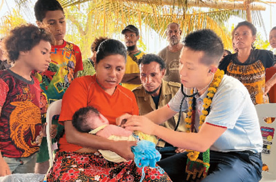 在巴布亚新几内亚中央省村庄里,第十二批援巴新中国医疗队副队长、新生儿科副主任医师刘振球为当地婴儿听诊检查。新华社记者 隋先凯摄