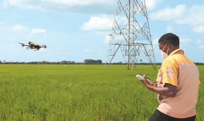 在乌干达卡隆古区卢卡亚镇中亿农业园,作业员赫伯特·阿加巴操控植保无人机喷洒农药。新华社记者 张改萍摄