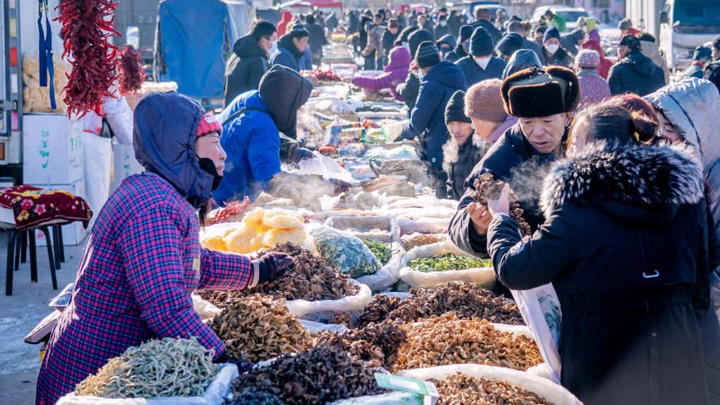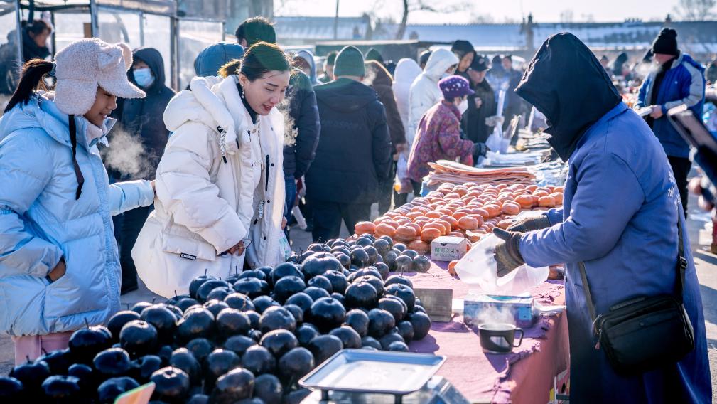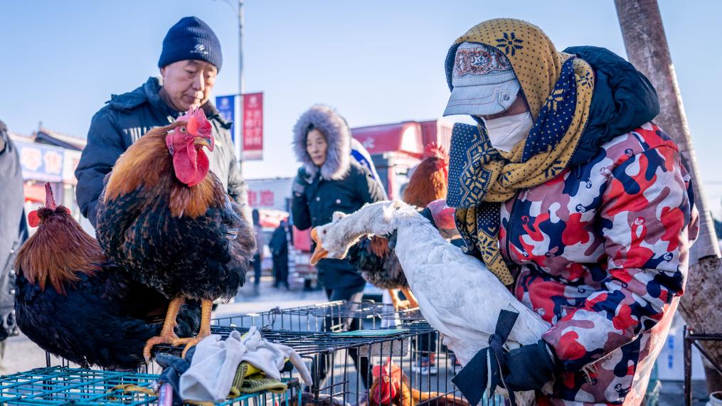 “冻梨冻柿子嘞,嘎嘎甜,不甜不要钱”“冰糖心苹果贱卖喽,3斤10块”“排骨18块1斤,棒骨8块1斤”……临近年关,吉林省长春市近郊的卡伦大集上,人群摩肩接踵,叫卖声此起彼伏。这个中国东北农村集市年味渐浓。