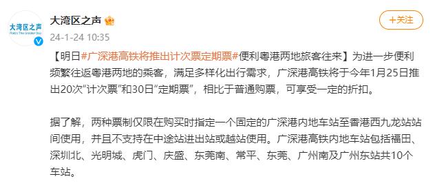 央视网消息:据@大湾区之声 消息,为进一步便利频繁往返粤港两地的乘客,满足多样化出行需求,广深港高铁将于今年1月25日推出20次“计次票”和30日“定期票”,相比于普通购票,可享受一定的折扣。