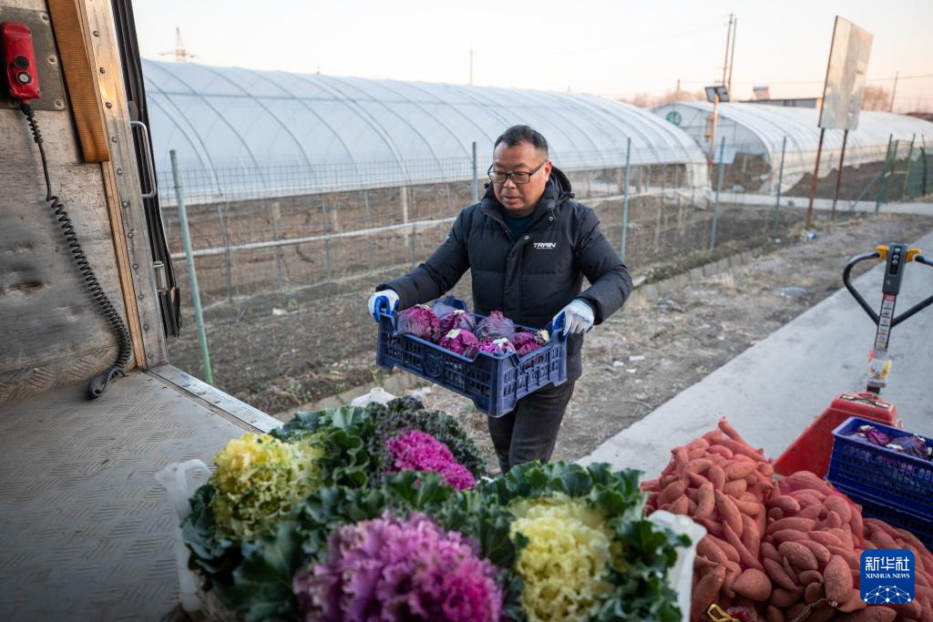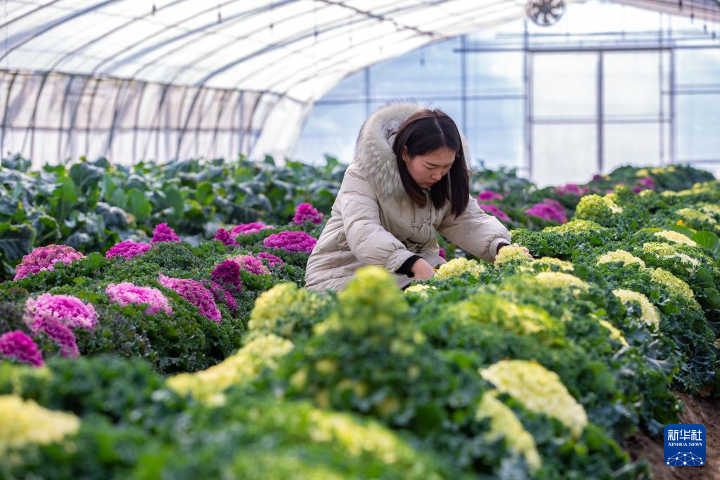 1月24日,农民在江苏省扬州市江都现代农业产业园蔬菜大棚内采摘羽衣甘蓝。