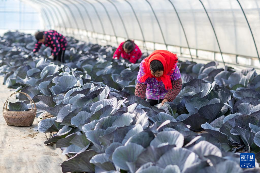 1月24日,农民在江苏省扬州市江都现代农业产业园蔬菜大棚采摘紫甘蓝。