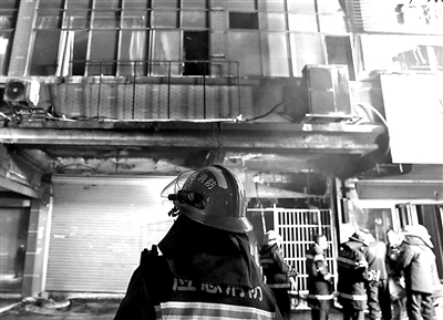记者24日晚在现场看到,临街多家店铺已经被浓烟熏黑,一些招牌被烧得残破不堪,消防人员正在紧张进行搜救工作。