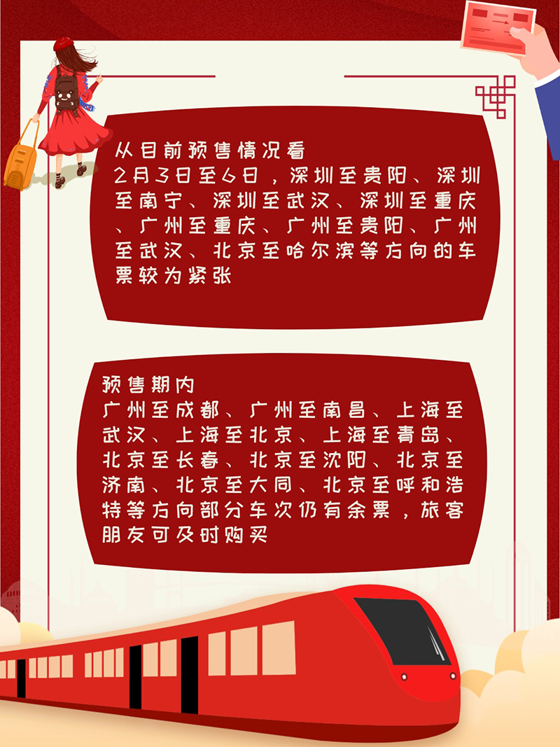 从目前预售情况看,2月3日至6日,深圳至贵阳、深圳至南宁、深圳至武汉、深圳至重庆、广州至重庆、广州至贵阳、广州至武汉、北京至哈尔滨等方向的车票较为紧张。预售期内,广州至成都、广州至南昌、上海至武汉、上海至北京、上海至青岛、北京至长春、北京至沈阳、北京至济南、北京至大同、北京至呼和浩特等方向部分车次仍有余票,旅客朋友可及时购买。