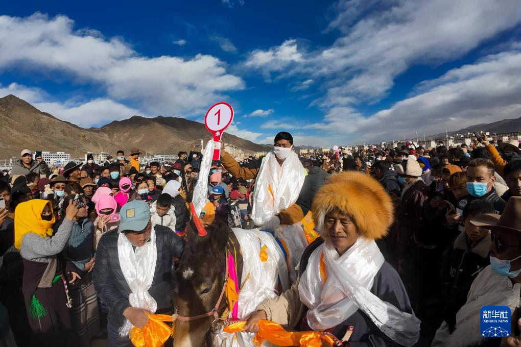 1月24日,夺得第一名的赛马选手在庆祝。新华社发 旦增努布 摄
