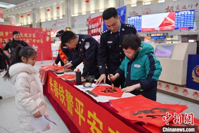 沈阳铁路公安局长春公安处的民警在为旅客送福字。张瑶 摄