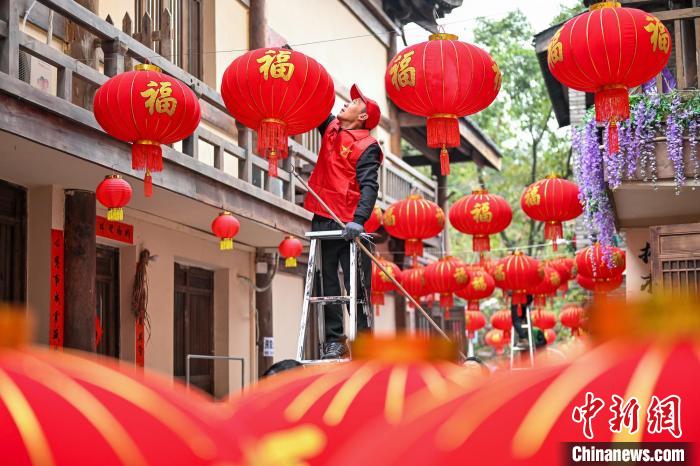 1月25日,临近春节,重庆市南岸区海棠溪街道敦厚街社区按照传统,在黄葛古道敦厚坡段挂灯笼、贴春联,迎新春。百年黄葛古道上张灯结彩,洋溢着浓浓的新春氛围。