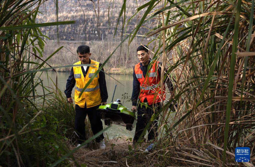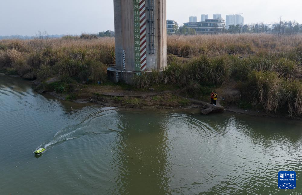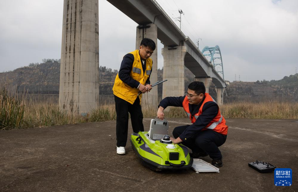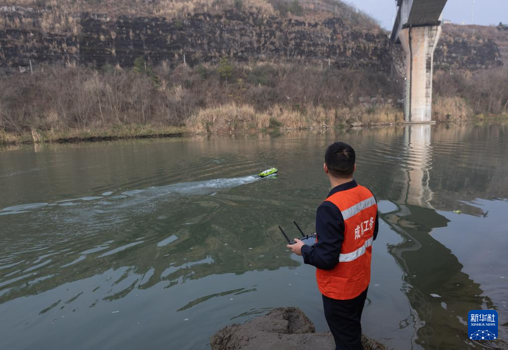 1月27日,在成渝城际铁路资阳沱江多线特大桥下,成都高铁工务段工作人员张硕操控着无人船探测沱江水情。