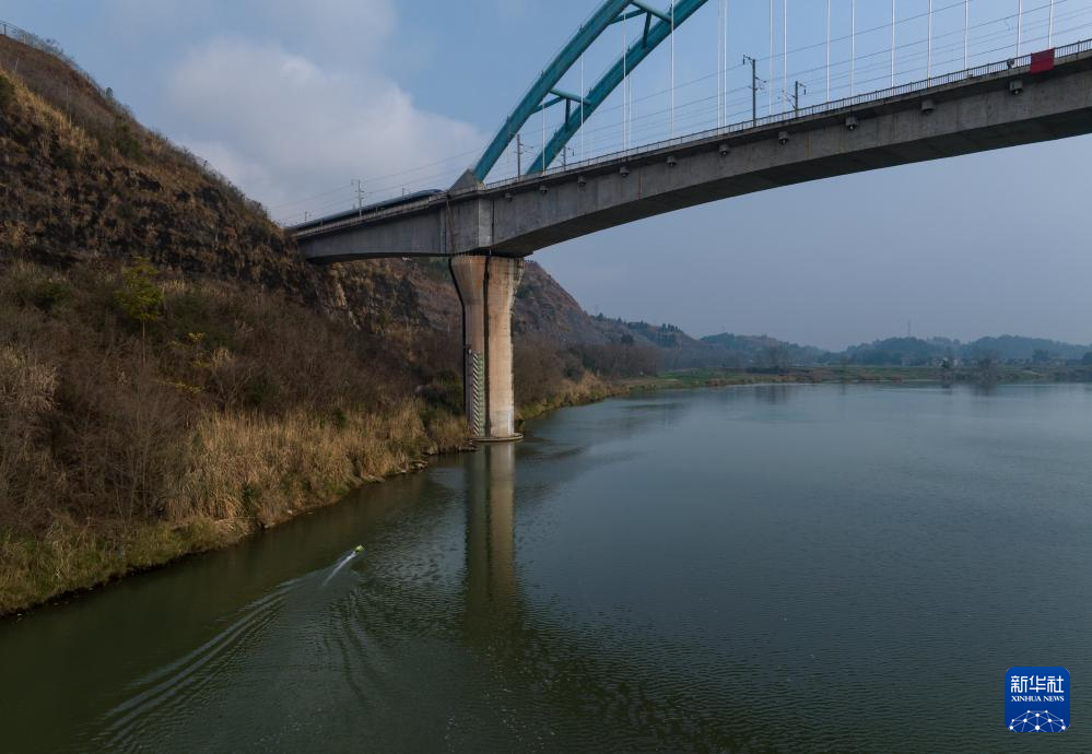 1月27日,在成渝城际铁路资阳沱江多线特大桥下,成都高铁工务段工作人员张硕在操控无人船。