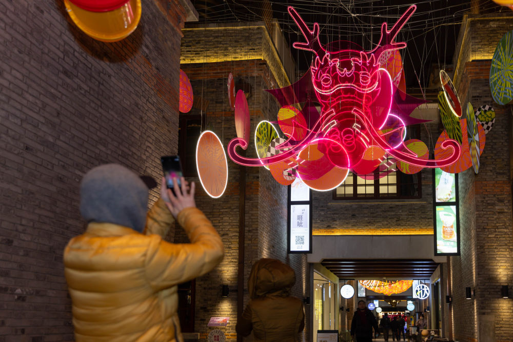 在上海市虹口区四川北路的“今潮8弄”,人们在龙年灯光艺术装置点缀的弄堂中拍照(2024年1月26日摄)。新华社记者 王翔 摄