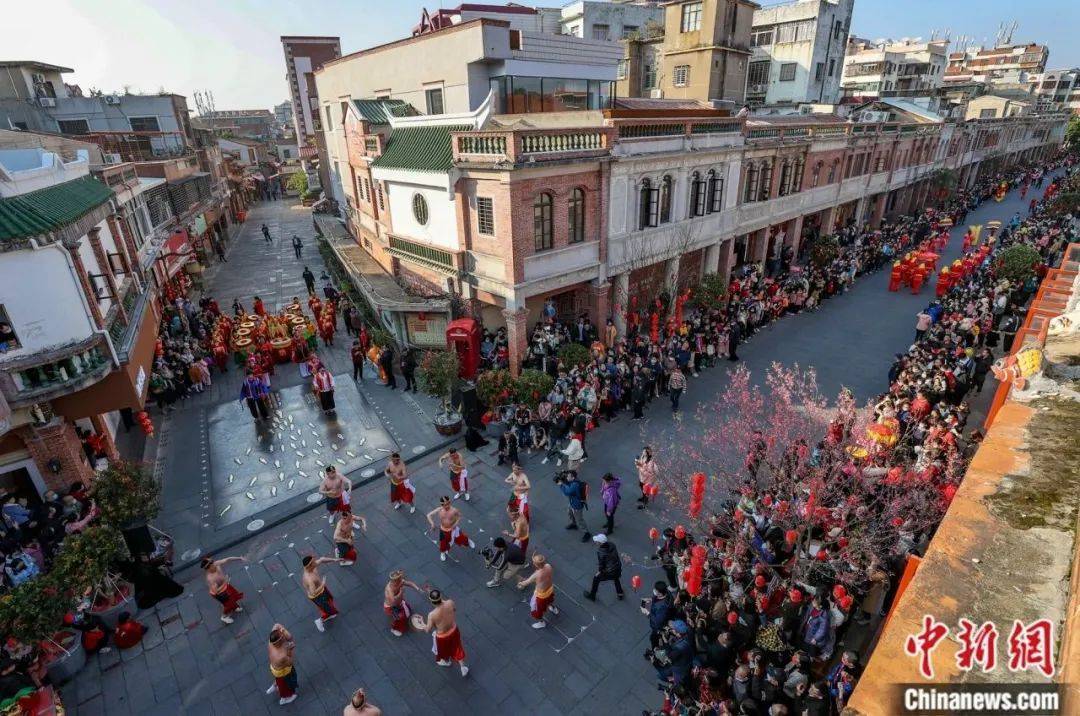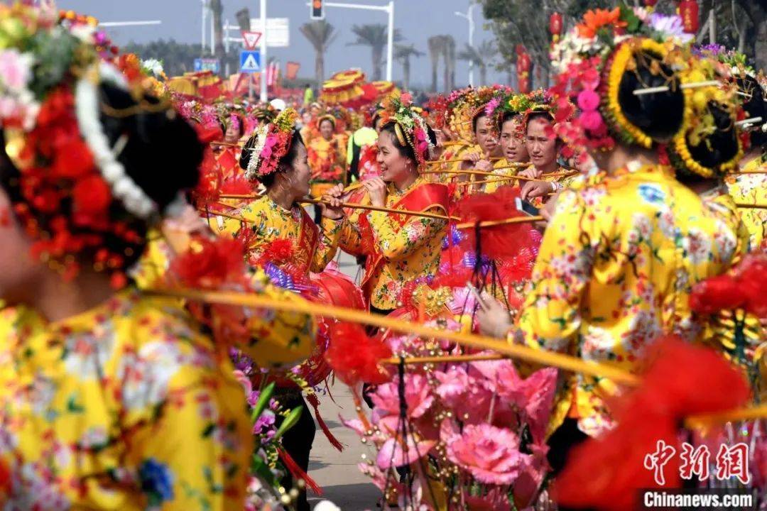 “蟳埔女”头戴“簪花围”踩街。中新社记者 王东明 摄