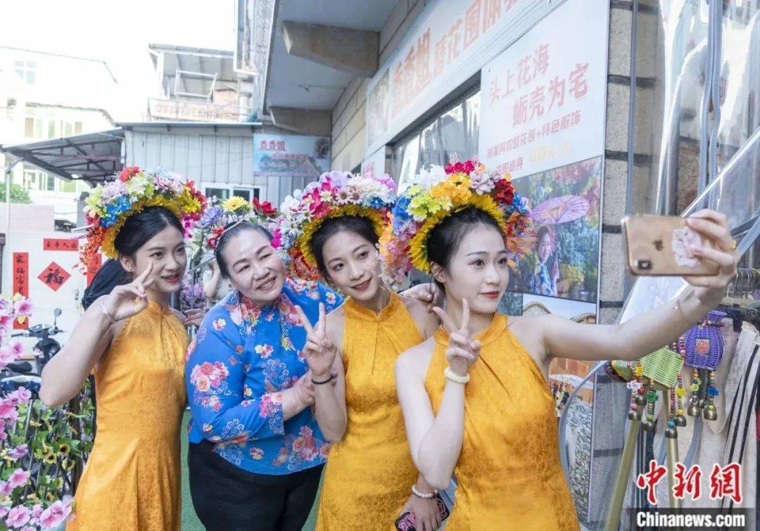 游客在泉州蟳埔村体验当地渔女“簪花围”头饰。张旭 摄
