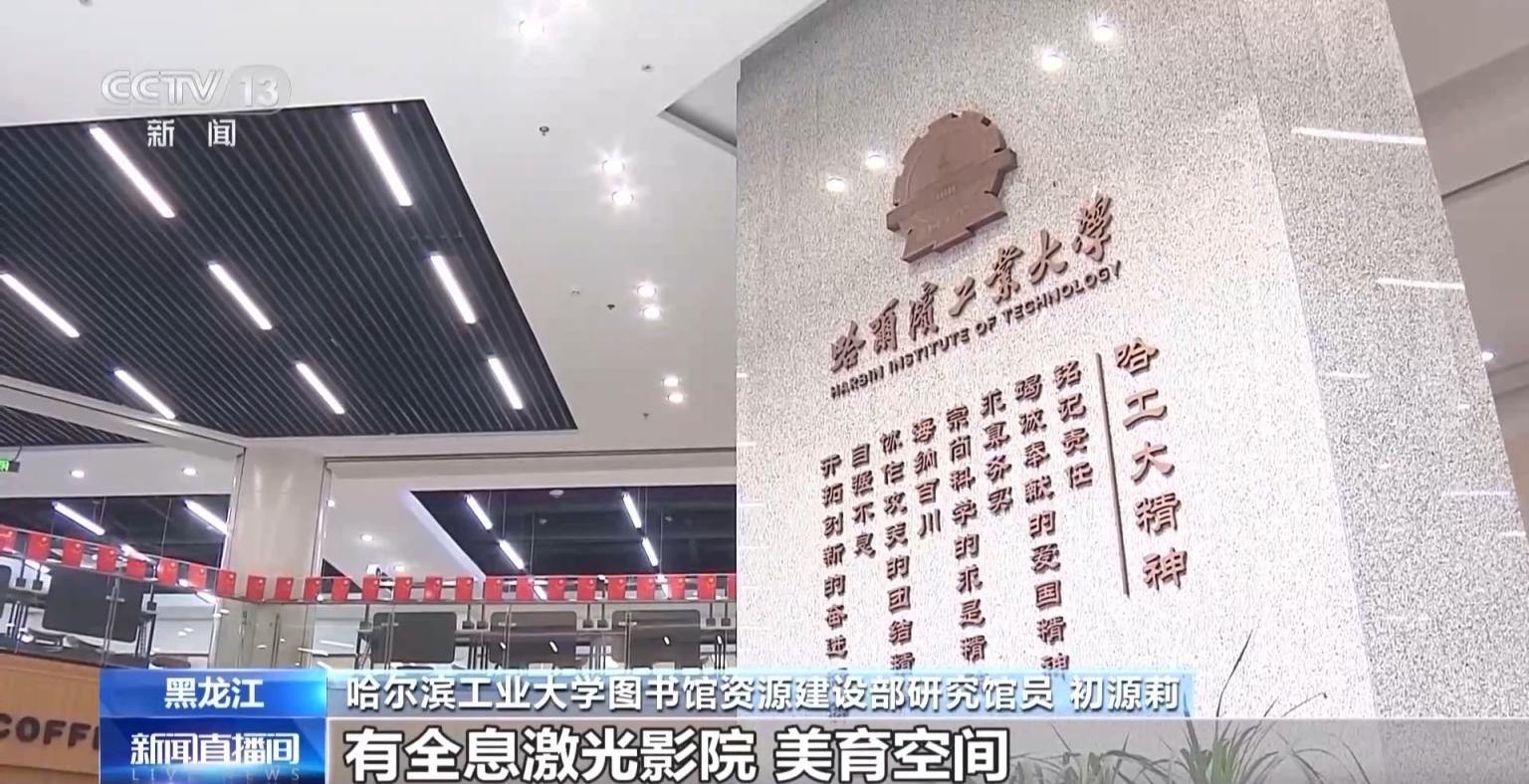 哈尔滨工业大学图书馆资源建设部研究馆员 初源莉:我们开放的区域主要集中在四楼和五楼,有全息激光影院、美育空间,还有虚拟现实体验空间,在全国高校图书馆当中都是独树一帜的,游客可以通过我们学校的官方网站和官方微信进行预约。