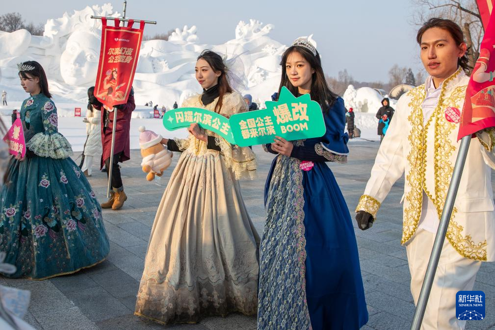 当日,在哈尔滨太阳岛雪博会园区内,演职人员盛装巡游,与游客亲切互动,成为“雪世界”的一道浪漫风景。