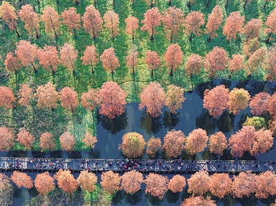 游客在上海青西郊野公园的水上森林欣赏美景。新华社发(王须中 摄)