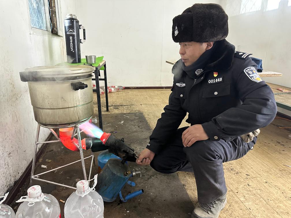 在活动板房内,詹江龙用汽油喷灯加热高压锅(1月19日摄)。新华社记者 王金金 摄