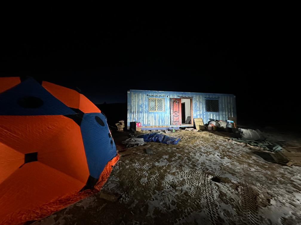 此时,营地室外温度直逼零下40摄氏度,呼啸的寒风让人睁不开眼。顾不上休息,巡山队员迅速从车上卸下装备,将钢钉用力敲进地面,一顶橘色的帐篷在活动板房前快速撑开。詹江龙对我说:“今晚你们和随行医生住在房子里,队员们住帐篷。”