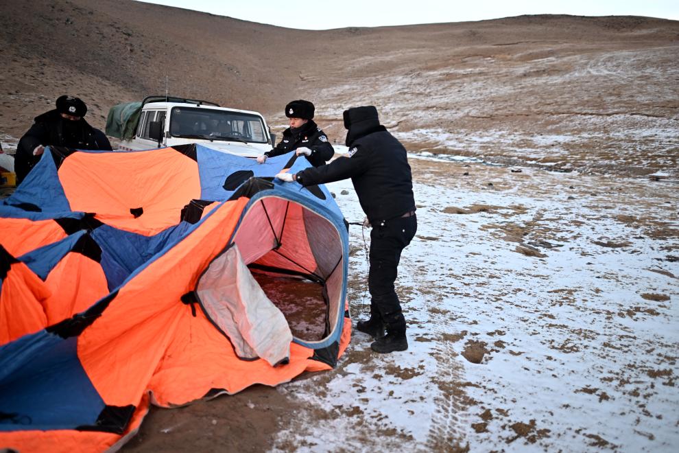 詹江龙(右二)和同事在可考湖幸福沟搭帐篷(1月19日摄)。新华社记者 张宏祥 摄