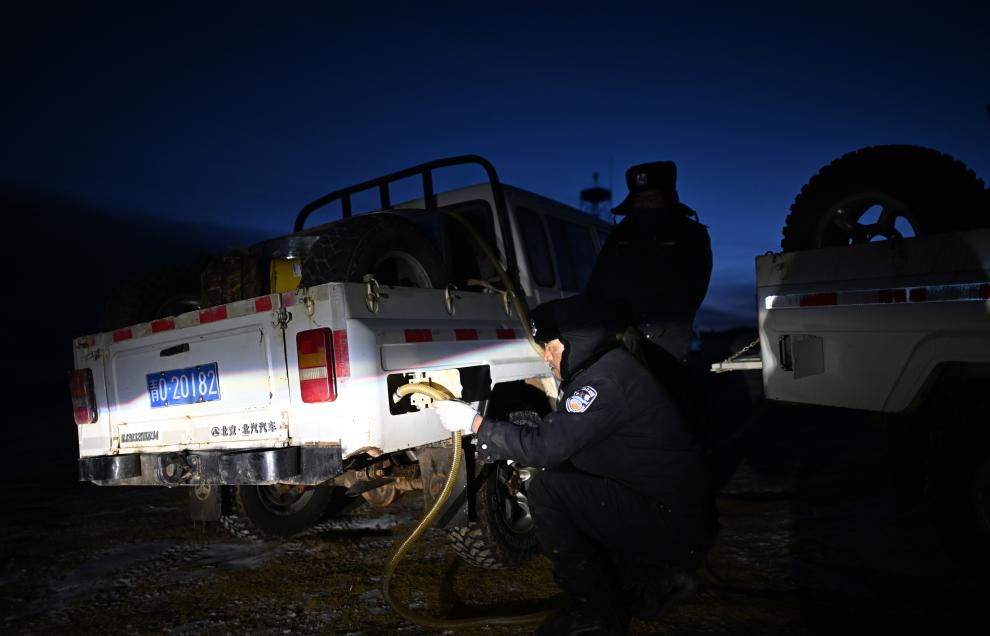尼玛扎西(前)在可考湖给巡山车辆加油(1月19日摄)。新华社记者 张宏祥 摄