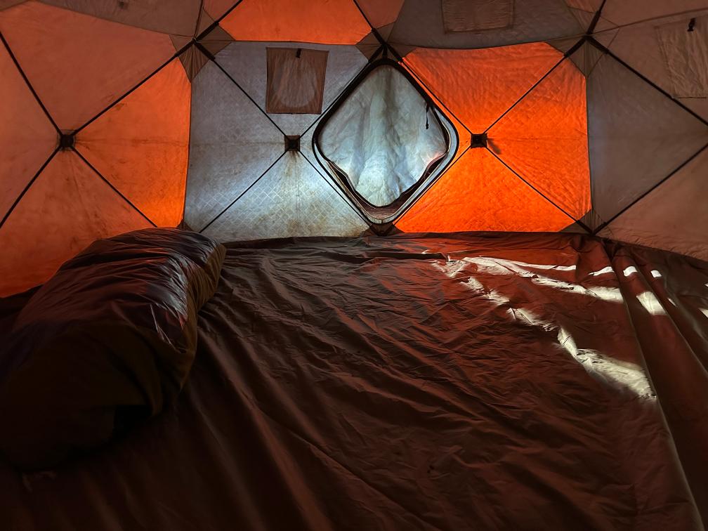 与极寒环境相比,这顶帐篷“薄如蝉翼”。搭好帐篷后,巡山队员钦饶南江将一个酷似老式沙发垫的布袋拖进帐篷:“这个‘马搭子’就是我们的睡袋,里面装了棉花,最中间套了一个棉睡袋,这样暖和点儿。”