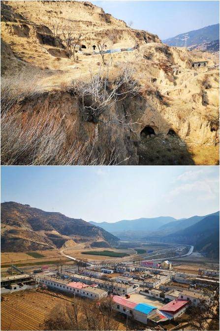 黄土高原上的山西省中阳县万年饱村旧村(上图)和新村(下图)对比图。新华社记者 吕梦琦 摄
