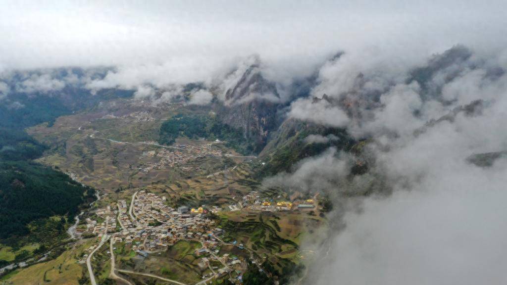雨后扎尕那,村庄在雾气中若隐若现(2020年10月13日摄,无人机照片)。新华社记者 陈斌 摄